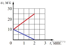 Версия для печати и копирования в MS WordПостройте графики зависимости скорости от времени для двух автомобилей, движущихся по прямолинейному участку дороги. Известно, что первый автомобиль в течение первых 2 мин. равноускоренно набирает скорость от 10 м/с до 25 м/с. Второй автомобиль, имея в начальный момент времени скорость 36 км/ч, тормозит с постоянным ускорением и через 2 мин. останавливается.