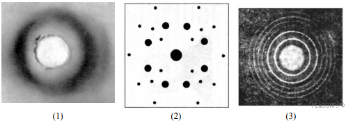 На рисунках представлены дифракционные картины, полученные на монокристалле, металлической фольге и воде. Какая из картин соответствует дифракции на металле?