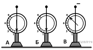 На рисунке изображены три одинаковых электрометра. Шар электрометра А не заряжен, шар электрометра Б не заряжен, а шар электрометра В заряжен отрицательно и показывает заряд 9 ед.. Каковы будут показания электрометров А и Б, если их шары соединить тонкой медной проволокой шаром электрометра В ?