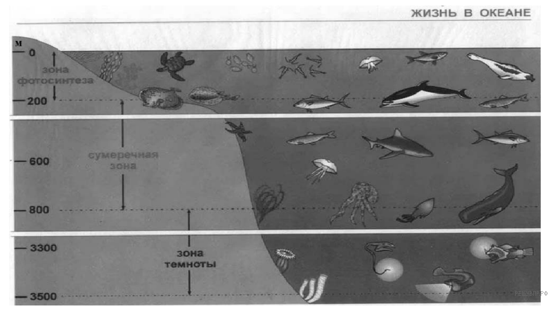 Подводный аппарат может безопасно работать при внешнем давлении до 500 кПа. Можно ли использовать данный аппарат для исследования всей морской зоны фотосинтеза (см. рис.)? 1 атм. = 101 300 Па. Плотность морской воды 1030 кг/м3.