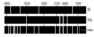 На рисунках приведены спектры излучения атомарных паров водорода, натрия и неизвестного газа (см. рис.).