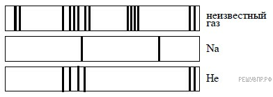 На рисунках приведены спектры излучения атомарных паров натрия, неизвестного газа и гелия (см. рис.).