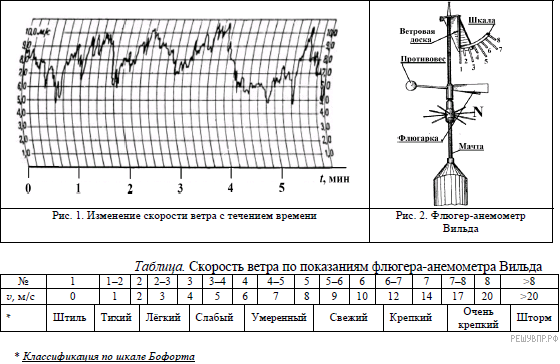 Флюгер Вильда в силу инерционности ветровой доски измеряет _______________ скорость. При скорости ветра показанной на графике (рис. 1) в интервале 4 мин. 20 с — 4 мин. 40 с, положение ветровой доски будет соответствовать цифре _______________ на шкале.