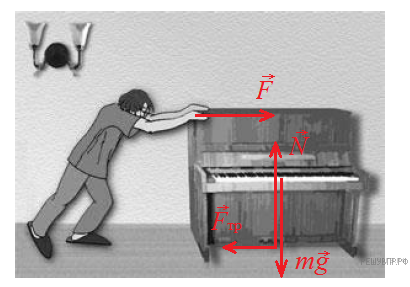 Человек пытается передвинуть пианино вдоль стены. Изобразите на данном рисунке силы, которые действуют на пианино, и направление его ускорения, если инструмент удалось сдвинуть с места.