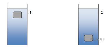 В момент времени 1 тело массы m было погружено на глубину h в стакан с жидкостью. Затем до момента времени 2 тело всплывало и остановилось на определенной глубине. Нарисуйте все силы, действовавшие на тело в момент времени 1 и в момент времени 2.