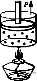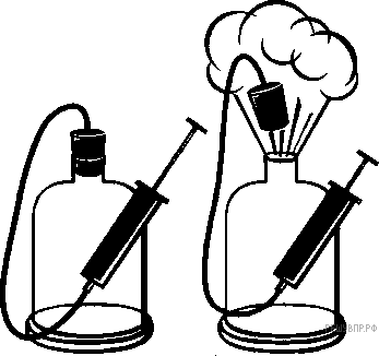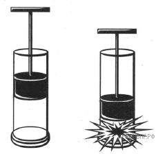 На дне толстостенного стеклянного сосуда находится маленький кусочек ваты, смоченной спиртом. При резком ударе по рукоятке плотно пригнанного поршня сильно сжимается воздух и ватка воспламеняется.