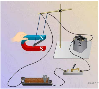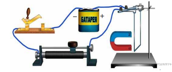По прямому горизонтальному проводнику, висящему на длинных тонких проволоках, пропускают электрический ток от батарейки. К проводнику подносят постоянный подковообразный магнит. В какую сторону (вправо, влево, вверх, вниз) отклонится висящий проводник? Нарисуйте действующую на проводник силу.