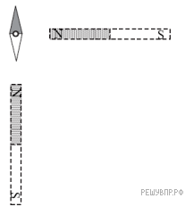Магнитная стрелка компаса зафиксирована (северный полюс затемнен, см. рис.). К компасу поднесли сильный постоянный полосовой магнит, затем освободили стрелку, она повернулась и остановилась в новом положении. Изобразите, новое положение стрелки.